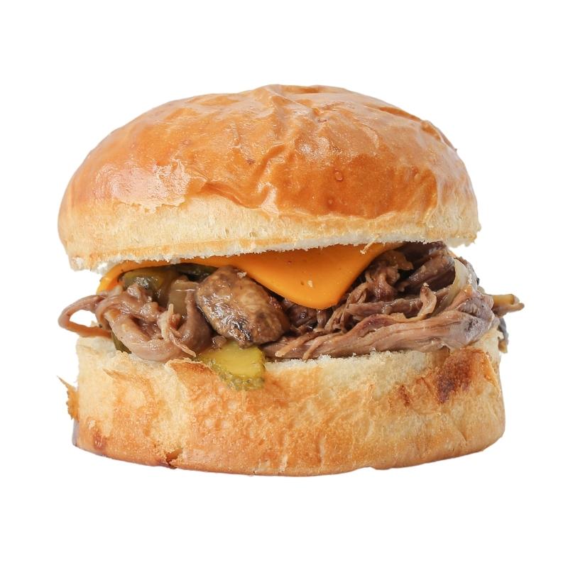 Tiftiklenmiş döş eti,cheddar peyniri, bbq sos,karamelize soğan,sote mantar,turşu