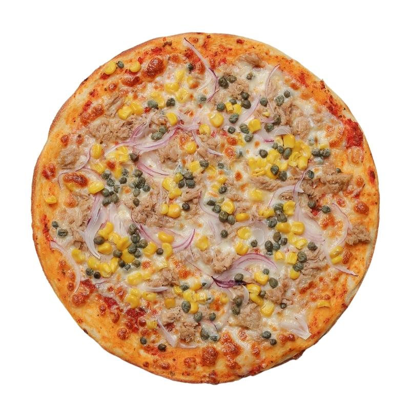 Domates Sos, Mozarella, Ton Balığı, Kapari, Kırmızı Soğan, Roka, Mısır