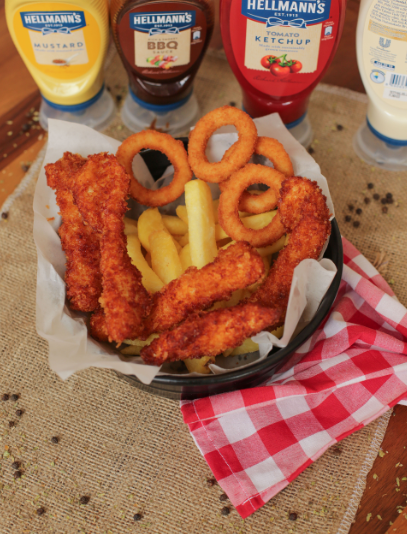 4 adet çıtır tavuk, 4 adet soğan halkası, patates kızartması